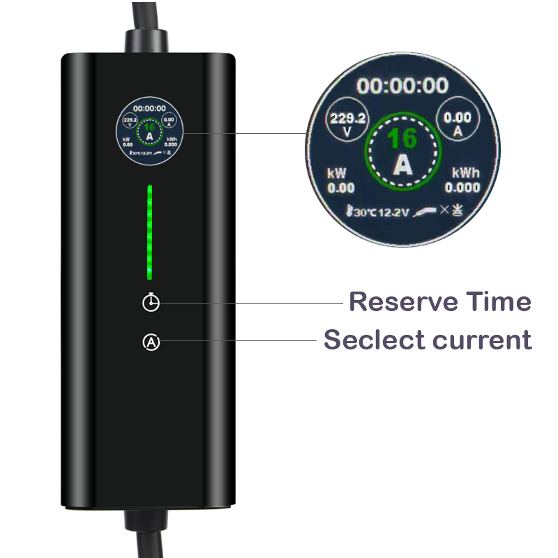 - Blauwe knop (stroom instellen): Steek eerst de netstekker in het stopcontact. Druk herhaaldelijk op de blauwe knop tot de gewenste stroom (8A/10A/13A/16A) op het LCD verschijnt. Steek daarna de Type 2-stekker in de auto – laden start direct.