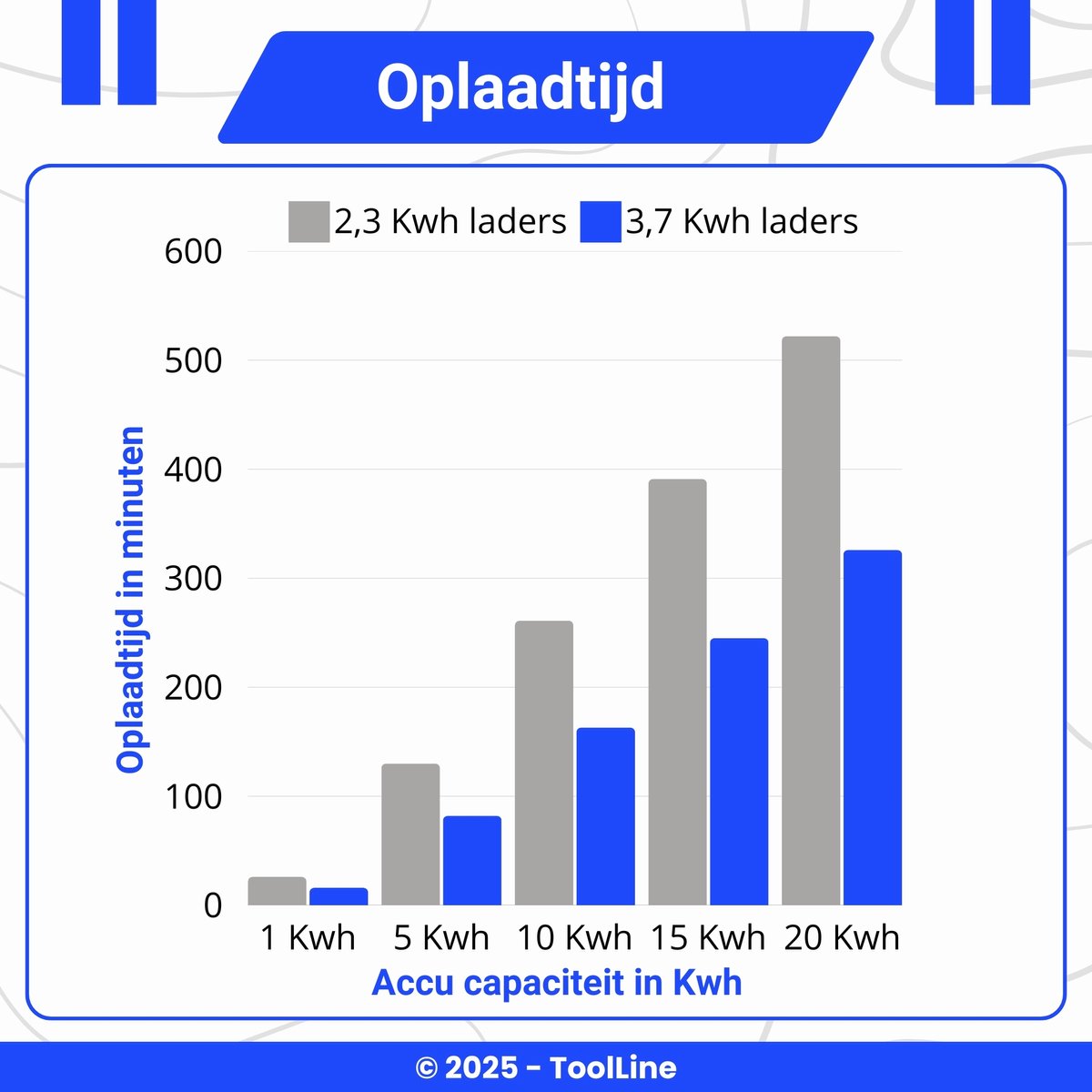 - Maximaal vermogen: 3,7 kW (1-fase, 16A bij 230V). Genoeg kracht voor e-bikes, scooters, gereedschap, kampeerspullen of zelfs een kleine koelkast.